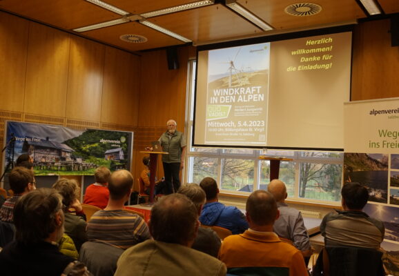 Am 5. April 2023 lud der Salzburger Alpenverein zu einem Vortrag ins Bildungshaus St. Virgil. Herbert Jungwirth, Umweltschutzreferent im Alpenverein Oberösterreich, sprach über “Windkraft in den Alpen – quo vadis? Die Alpen im Spannungsfeld der Energiewende”
