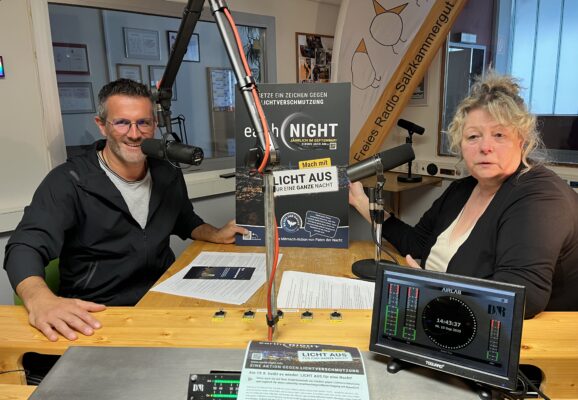 Über Lichtverschmutzung und Lichtverschwendung sprechen im Studio des Freien Radio Salzkammergut Ursula Asamer (Natur- und Landschaftsvermittlerin im Naturpark Attersee Traunsee und Naturwache-Organ) und Clemens Schnaitl (Schutzgebietsmanager Naturpark Attersee-Traunsee und Koordinator von Österreichs ersten Sternenpark sowie Obmann des Vereins „Paten der Nacht“).